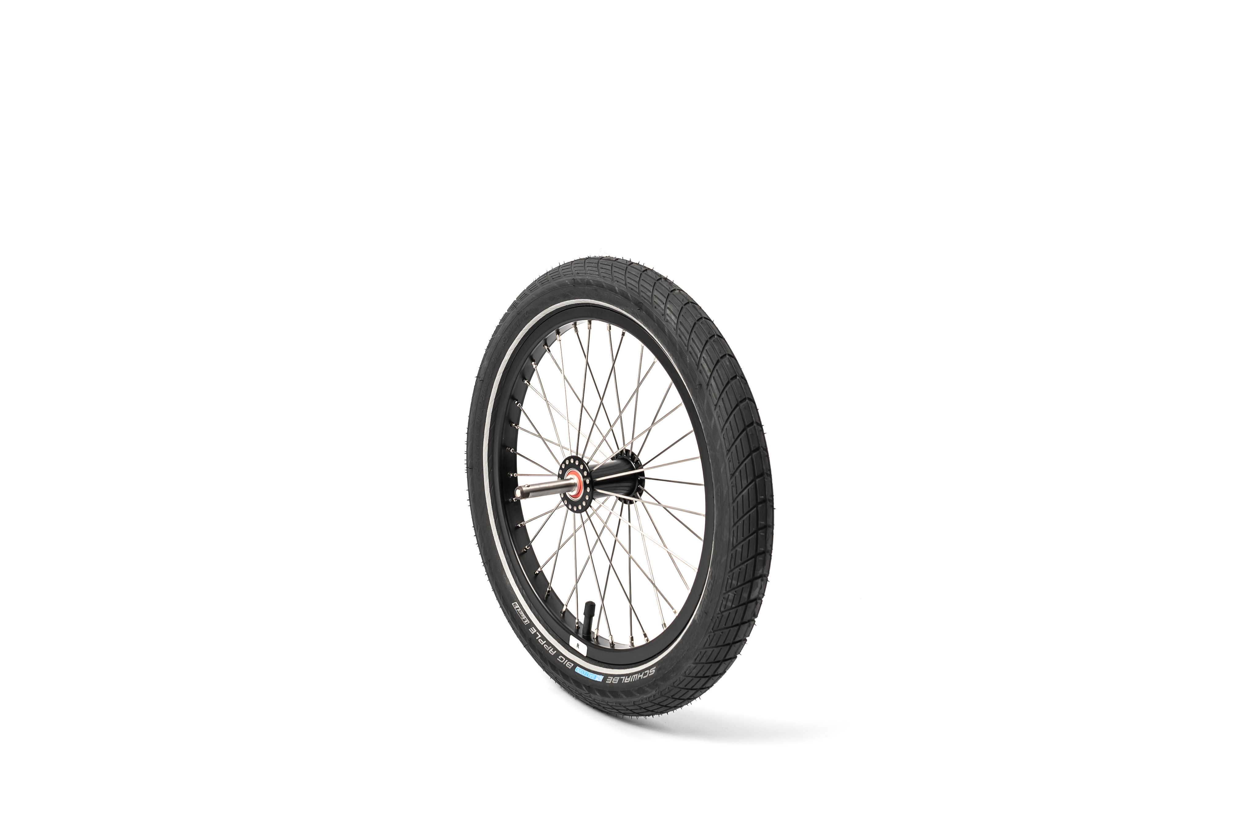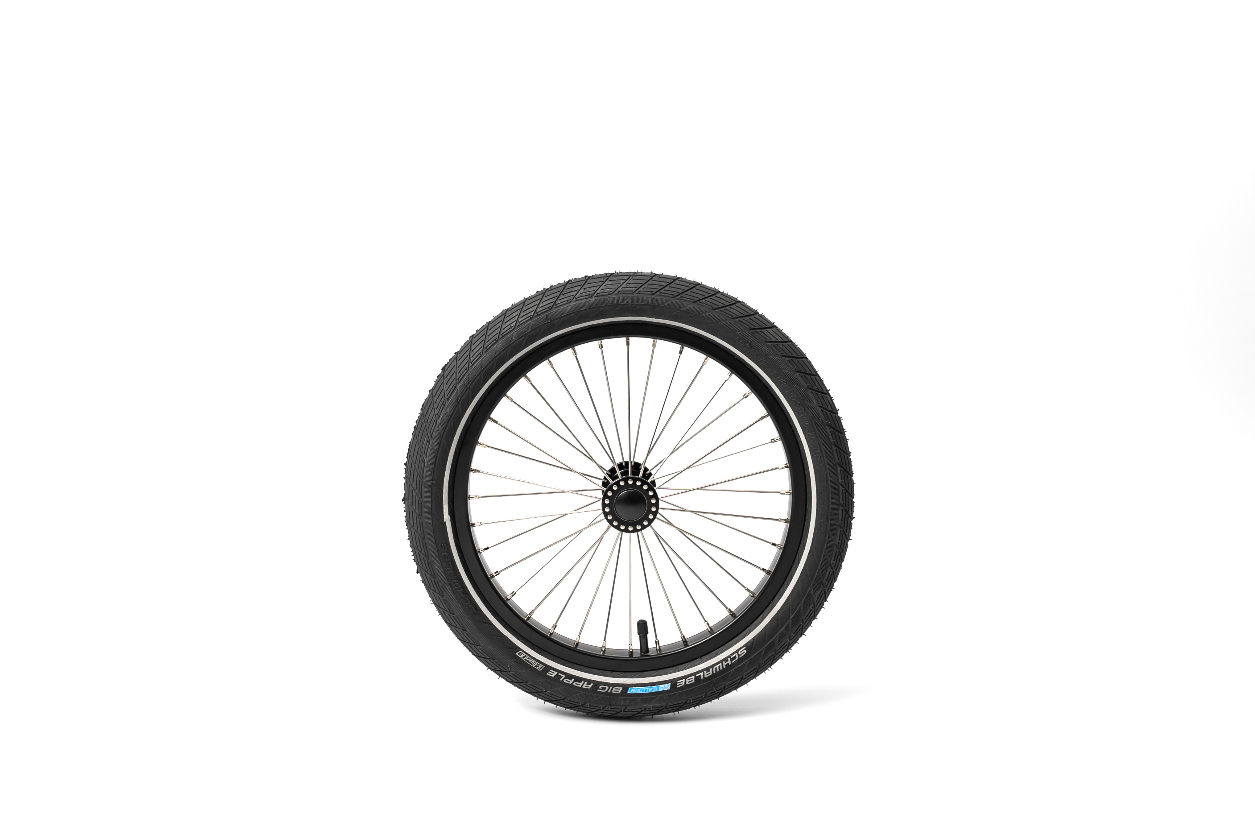 Das Laufrad ist mit Schwalbe Big Apple bereift. Es kann aktuell Abweichungen in der Bereifung geben. Durch die integrierte Steckachse mit Knopf ist das Laufrad sehr einfach zu montieren.
