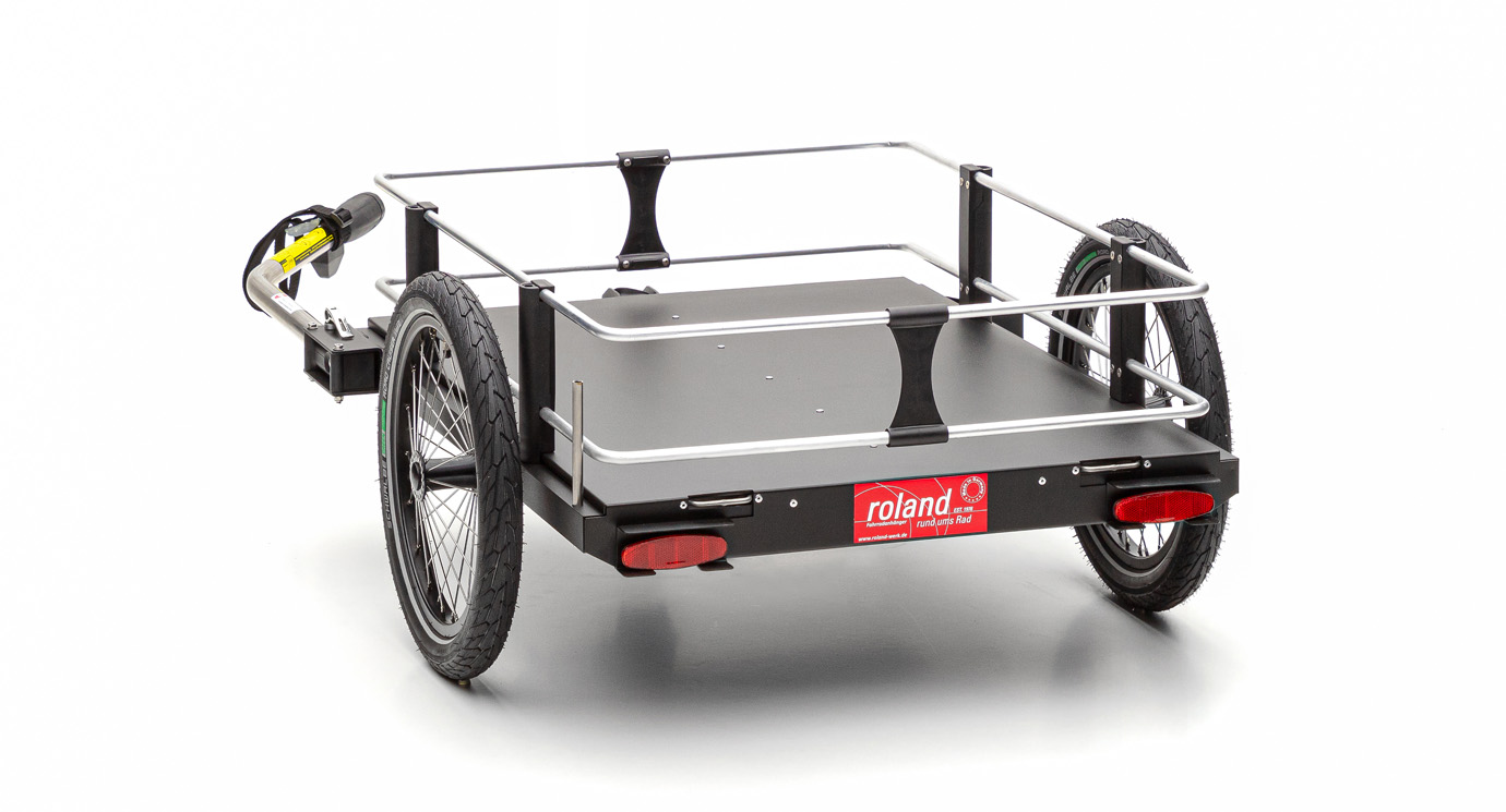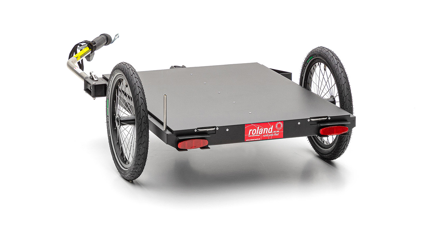 Der Fahrradanhänger besteht aus einem Rahmen und einer Bodenplatte aus Aluminium, einer Tiefdeichsel (umsteckbar für Handwagen-Nutzung), Weber E-Kupplung und Wimpel.