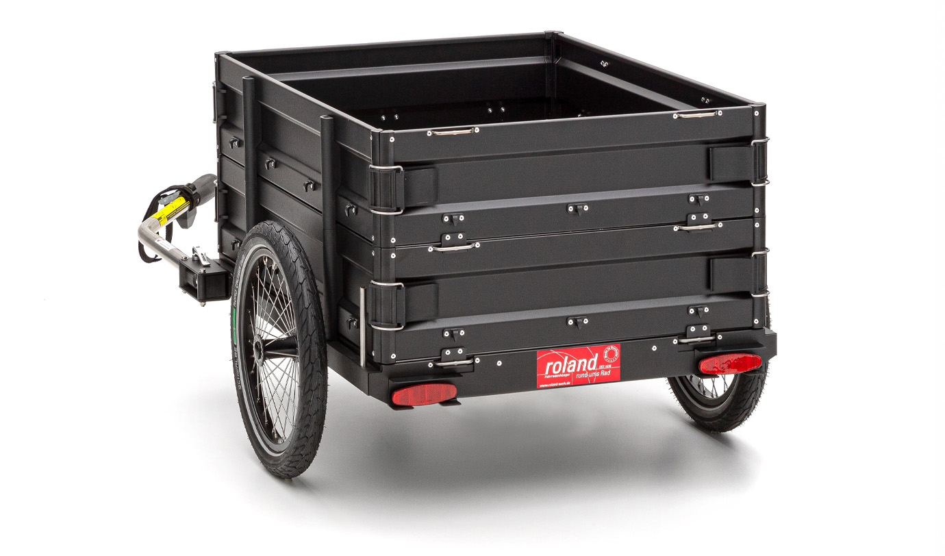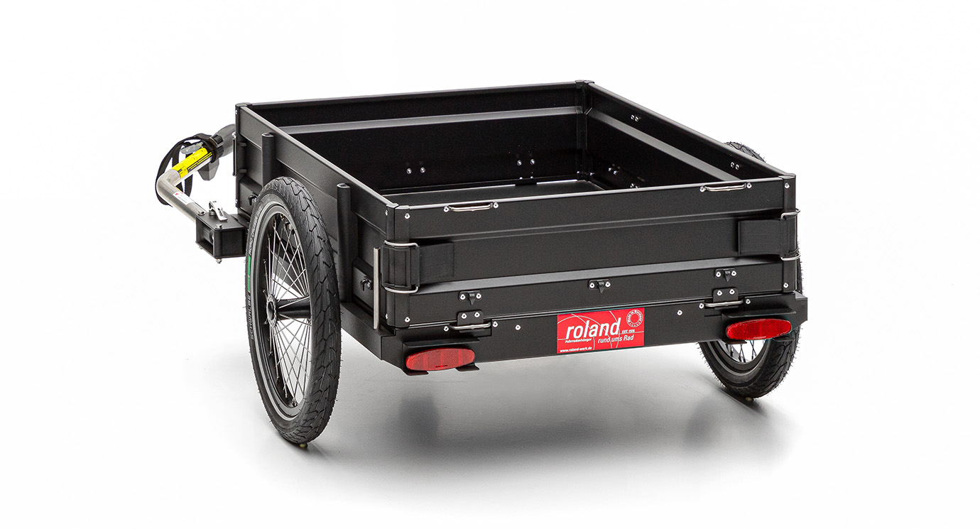 Der Fahrradanhänger besteht aus einem Rahmen und einer Bodenplatte aus Aluminium, einer Tiefdeichsel (umsteckbar für Handwagen-Nutzung), Weber E-Kupplung und Wimpel plus zwei Sätzen der modularen, erweiterbaren Bordwand.